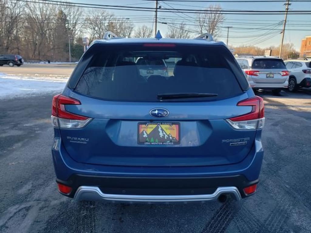 Finished in striking Horizon Blue Pearl, this Forester rides on 18-inch dark gray machine-finish alloy wheels and features roof rails, a power liftgate, rear spoiler, and clean body-color accents.