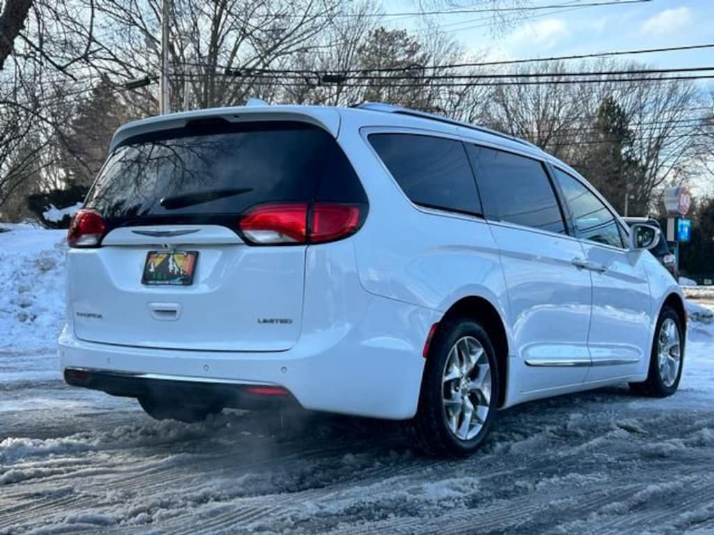 Finished in Bright White Clearcoat, this Pacifica stands out with 18-inch polished aluminum wheels, front fog lights, power moonroof, power liftgate, and sleek body-color accents.
